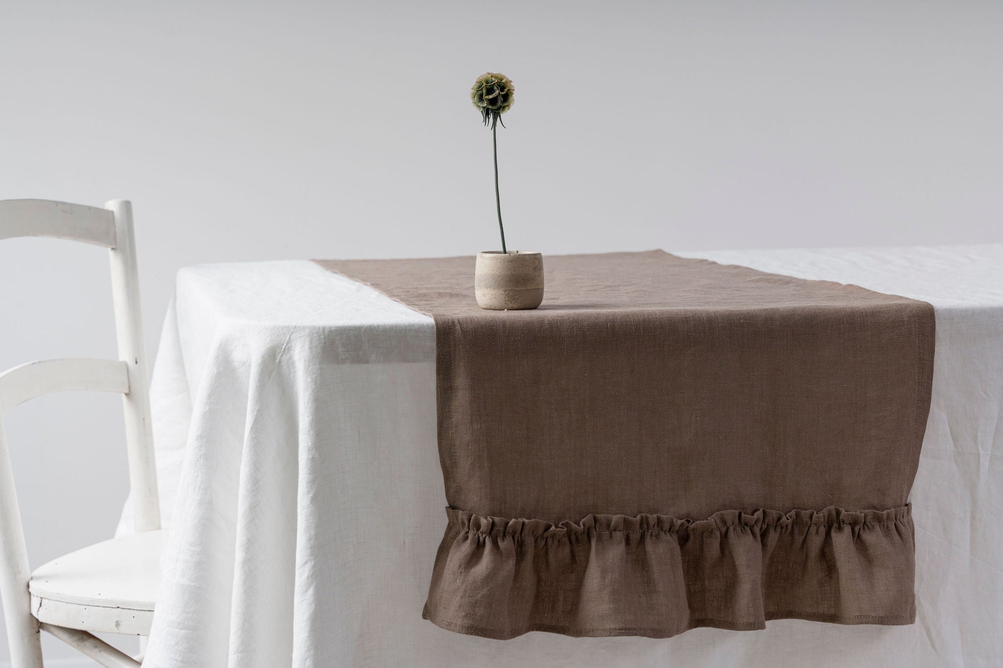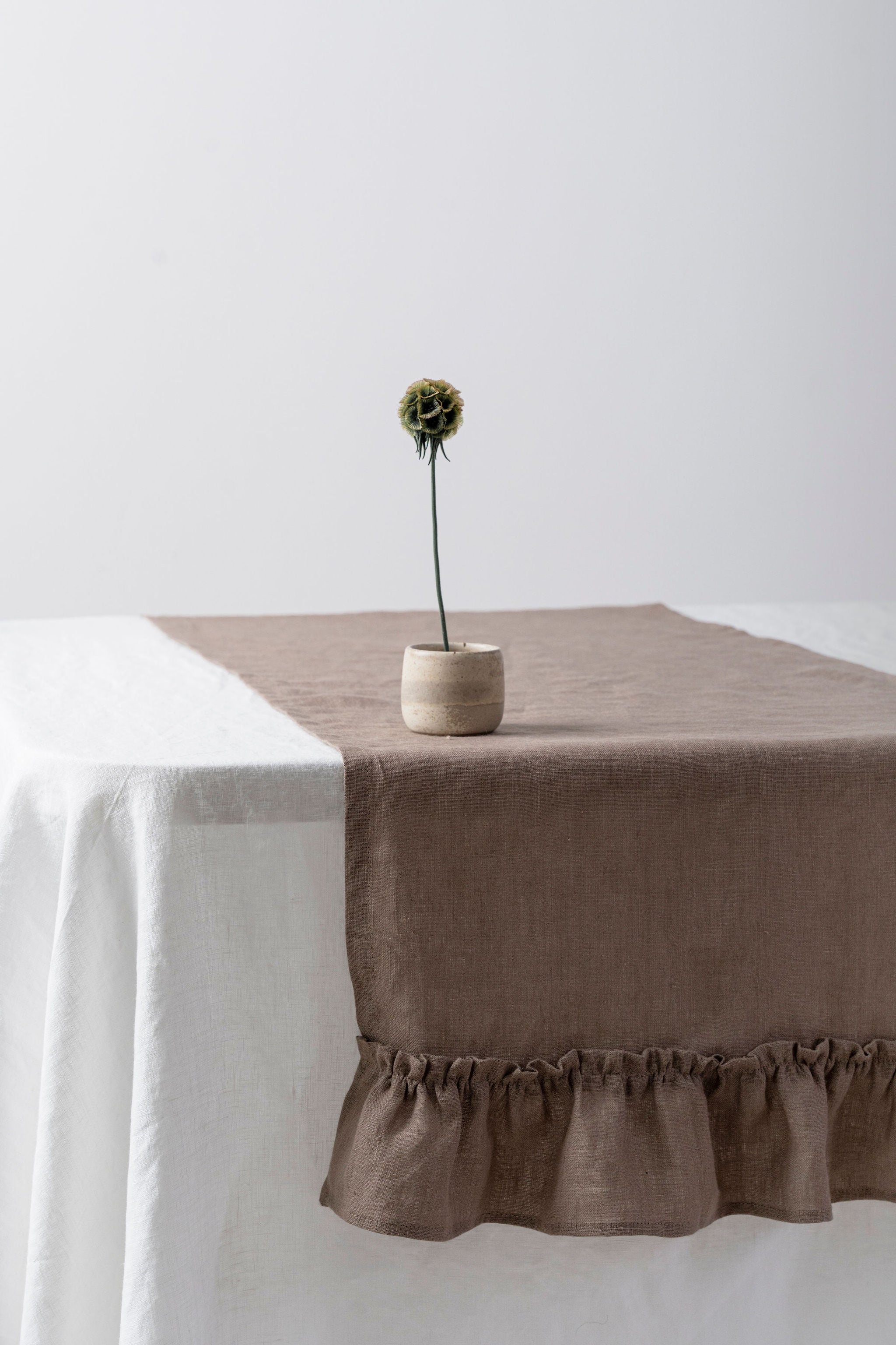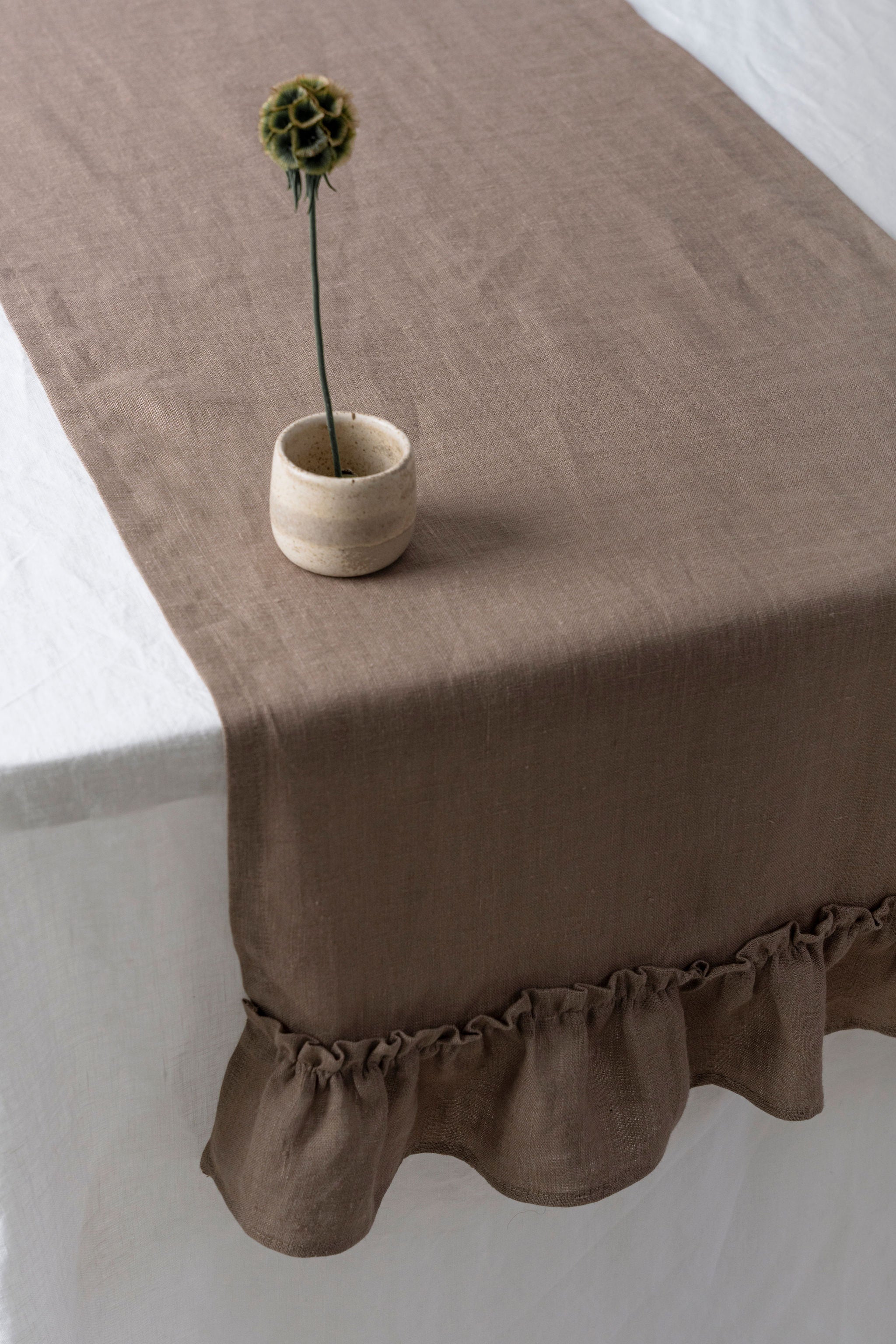 Cappuccino - linen table runner with ruffles